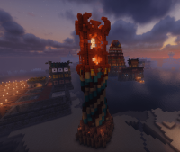 The center island and the biggest of them all has the Tahusemua, a large and colorful temple-like building. Here you can find a banner and map museum, as well as the oldest discovered map of the Shire: Map 57. It has a stage with a speaker chair for lawsuits, entertainment, government debates, et cetera. The top of the building is like a clock with 5 sections, each indicating a type of event currently going on. It defaults to the middle section, the pink one, which indicates no event.