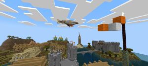 Palustris features the Palustris Royal Palace as its landmark, along with wood-based vernacular buildings generally featuring two to four stories and an attic. The town has two squares, one in the southeast and one in the north (named Vornschmidt Square). The hilltops of Palustris feature small temple-like structures made from prismarine walls and golden roofs. Outside of these, Palustris also contains a small cemetery, three bridges (including one to the palace), a lighthouse, a Mr. O's Industrial Strength Carpet Cleaners shop, and a tower separated from other building groups. The tower is situated northeast and has three 'stacks', each approximately equivalent in height to three stories. Within Palustris's WorldGuard jurisdiction, there is a tower on its southern sea made of diorite and magma blocks. An airship is visible in Palustris's sky.