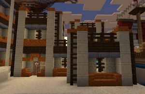 The main building's entrance leads directly to the throne room. Its throne is labeled "The Divine Baron pc1894 of Saguaria" and has sixteen audience chairs in front of it. A dining hall is located within the same building level. Stairs are placed left to the main building entrance door. The second level has six more audience chairs and the Baron's Office. The third and fourth level is empty; the former gives access to the west floor, while the latter is not accessible by stairs.